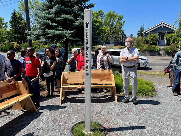 On a sunny Sunday, June 25, a Rotary Peace Pole was installed and dedicated at “Our Lady of Guadalupe”, 7000 35th Ave SW. The beautiful ceremony focused on the new garden space acknowledging the Duwamish Land that we share and our prayer for peace and goodwill. We are grateful to all our speakers for making this possible.