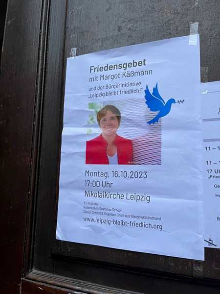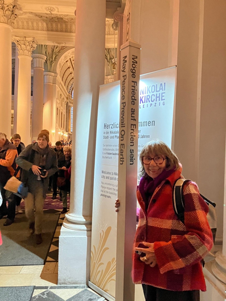 They have a mobile Peace Pole there and use it a great deal. They either roll it outside the laboratory or roll it to events, equivalent to the Monday peace prayer in the nearby Nikolai Church. That church is known to all Germans because as early as 1982 peace activists, environmental campaigners and human rights groups began to organize regular prayers for peace each Monday at St. Nicholas Church. After the Monday prayers on October 9, 1989, more than 70,000 people had assembled in Leipzig to protest, and this led to the fall of the Berlin wall!