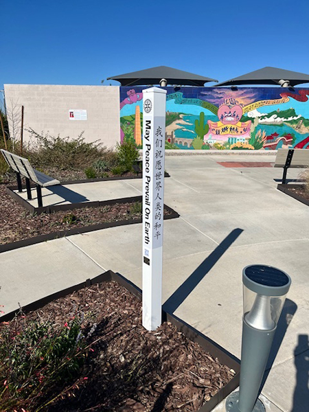 I have attached a photograph of the Peace Pole as requested. Sorry for the delay. It is part of the Gilbert Sister Cities Friendship Garden at the Gilbert Regional Park in Gilbert in Arizona. The garden celebrates our sister city relationships with Leshan, China and Antrim & Newtown abbey, Northern Ireland.