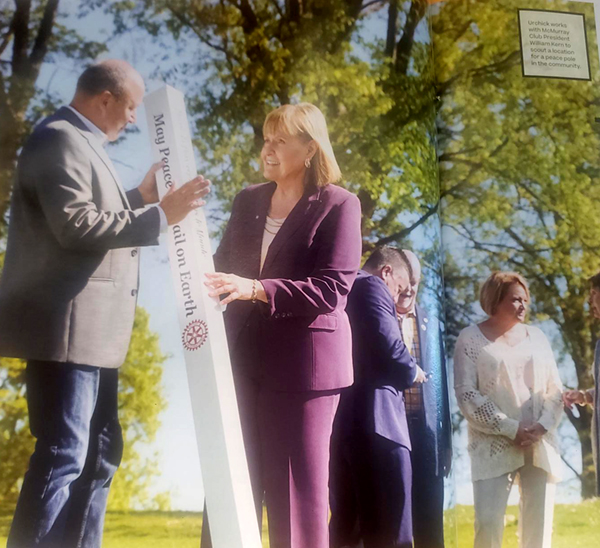 She encourages Rotary Clubs to put up these Peace Poles as visible signals of their commitment to peace, whether at member’s homes, in their club, their community or around the world.
