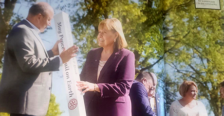 JULY-2024 One of the pillars of Urchick’s, peace push is, well, a pillar (Peace Pole). That afternoon after the club meeting, she joins members of the Rotary Club of White…