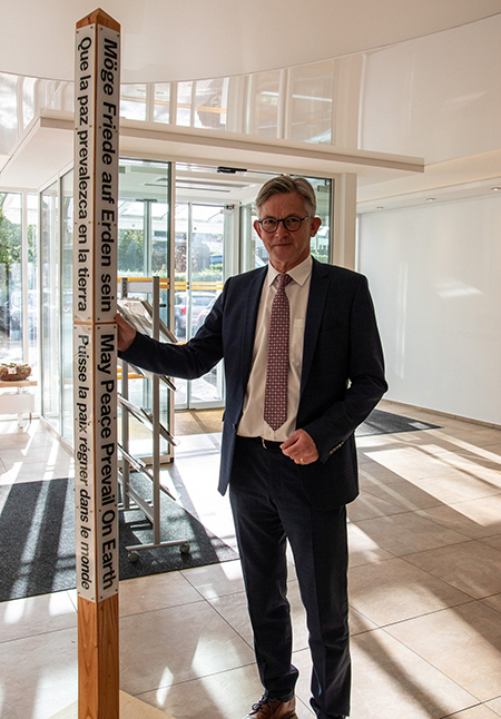 The 2.50-meter-high post made of larch wood bears the message “May Peace Prevail On Earth.” From now on, this simple but powerful statement will remind all citizens who enter the town hall of the importance of peace for our world.