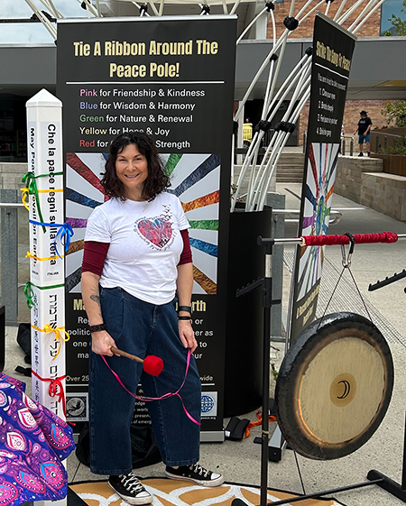 I also travel with my Peace Gong. Participants are asked to take a moment out of their day, to breathe deeply, think of their peaceful hearts and strike the gong sending those peace vibrations out across the globe.