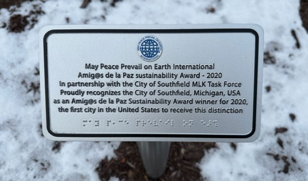 Three magnificent Peace Poles each highlighting 8 languages are standing proud on Barbara Talley Way in Southfield, Michigan.  A total of 24 languages represent the diverse community of Southfield where the annual Martin Luther King Jr Day has been celebrated for the past 40 years.  Barbara Talley founded the Martin Luther King Jr Taskforce which spearheads the annual MLK celebrations in addition to various other activities empowering youth in the community.  The Road leading up to the Peace Poles which stands near City Hall was named to honor the lifelong work of Barbara Talley.