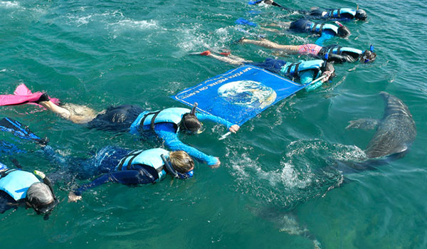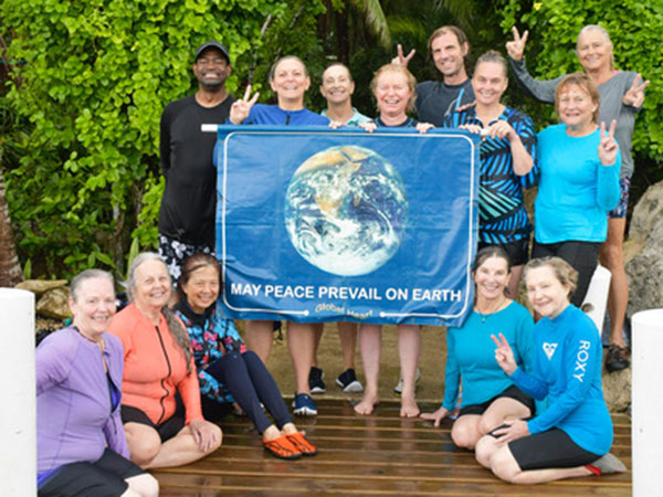 They explain how the message “May Peace Prevail On Earth” seems to act as a magnet, attracting swarms of curious Dolphins to come play around the Earth Flag in the open ocean. Some even stop to read the words.