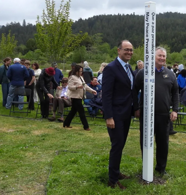 Rotary International Director Sérgio Almeida, left, and Rotary District 5130 President Jim O’Grady stand by the newly unveiled peace pole on the McLean Campus in Fortuna.