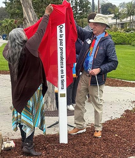 The Peace Pole carries the phrase “May Peace Prevail On Earth” in English, Spanish, Chumash, Japanese and Braille.