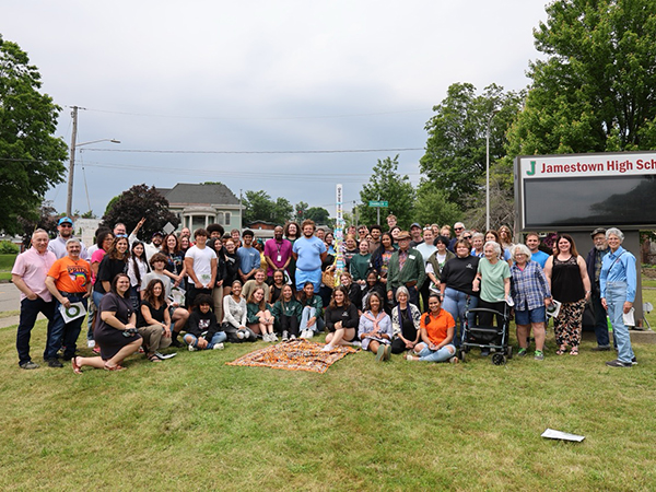 JHS students, Rotarians, and community members gather around the newly installed Peace Pole on the campus of Jamestown High School on the corner of Foote Avenue and Chandler Street above the JHS student parking lot. The Peace Pole was donated by the Rotary Club of Jamestown.