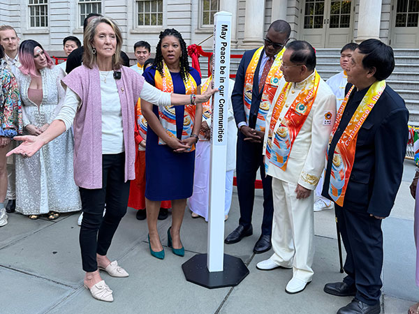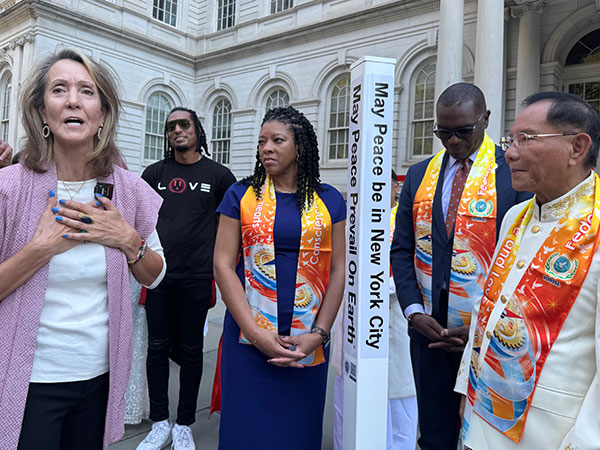 During the gathering, Fumi Johns Stewart, Executive Director of MPPOEI, presented Camille Joseph Varlack, Deputy Mayor for Administration and Chief of Staff of New York City, and Pastor Gilford Monrose, Faith Advisor to Mayor Eric Adams, with Peace Poles on the steps of City Hall. The ceremony set the tone for a weekend dedicated to unity, stillness, and shared commitment to peace.