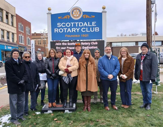 Scottdale Area Chamber of Commerce President David Mardis, Scottdale Public Library Director Kristy Smith, Southmoreland School District Assistant Superintendent Dr. Dan Clara, Scottdale Volunteer firefighter Donovan Gray, Scottdale mayor-elect Lindy House and YMCA of Laurel Highlands Executive Director Steve Simon, as well as representatives from the Scottdale Area Association of Churches, turned out Dec. 9 for the dedication of the Peace Pole planted by the Scottdale Rotary Club.