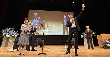 On the third day of his visit, he appeared at the Goi Peace Foundation Forum, where he received a certificate and a medal at the award ceremony. After introducing his activities using a short movie, he delivered a commemorative speech. He engaged in on-stage dialogue with Mr. & Mrs. Saionji about peace activities, various experiences, and ideas for future film production.