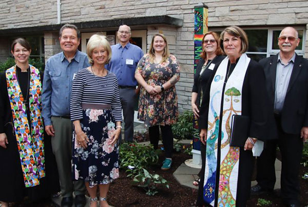 third from left, was Christine Peak, who leads its Peacebuilding Services Committee, and noted that the Peace Pole project dates back to 1976. They are meant to be a welcoming gesture, she explained. Second from left above is Greg Dirks, Fauntleroy Church’s vice moderator, who observed that “we all have a role to play in fostering peace.”