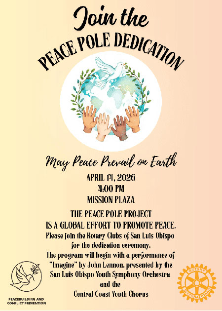 The dedication ceremony will include members of Rotary’s Peace Building committee, San Luis Obispo Mayor Erica A. Stewart, and features a special performance of “Imagine” by John Lennon by the San Luis Obispo Youth Symphony and the Central Coast Youth Choir. Community members, civic leaders, and Rotary representatives will gather to commemorate the installation and reflect on the importance of peacebuilding at the local level.