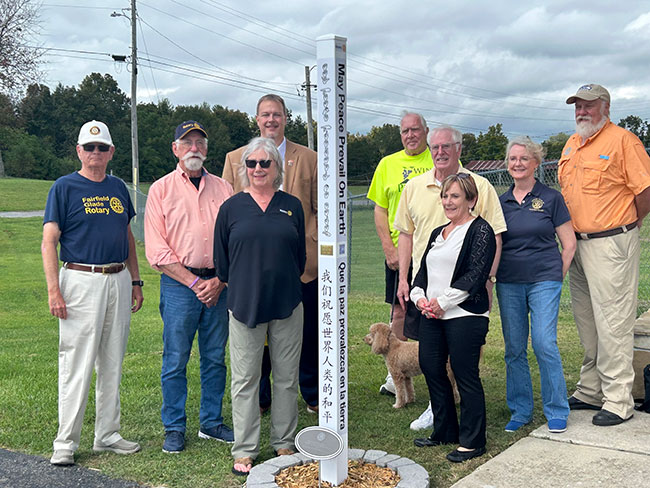 Our Fairfield Glade Rotary Club in Tennessee planted two Peace Poles through a District 6780 grant.  One was planted on the grounds of a community church in Fairfield Glade, and the other on Cumberland County fairgrounds property in Crossville, Tennessee.  Both sites were well supported by our community.