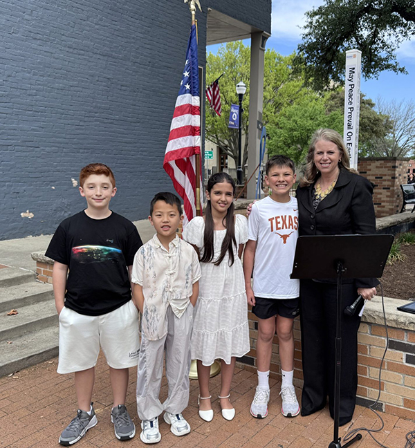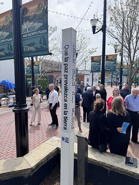 The Peace Pole, bearing the message, “May Peace Prevail On Earth,” is inscribed in four languages: English, Hebrew, Spanish, and Chinese. During the dedication event, students from Rockwall ISD, Jack Ross, Theo Segali, Marianne Garcia Gomez, and Simon Yang, read the phrase aloud in each language.