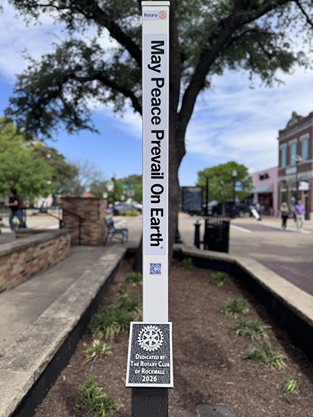 On Thursday, April 2, 2026, members of the Rockwall Noon Rotary Club joined with elected officials, community leaders, and local students to dedicate a new Peace Pole in San Jacinto Plaza. The installation, in Rockwall’s historic downtown, serves as a visible symbol of hope and unity, inspiring people to work together throughout the community and across the world.