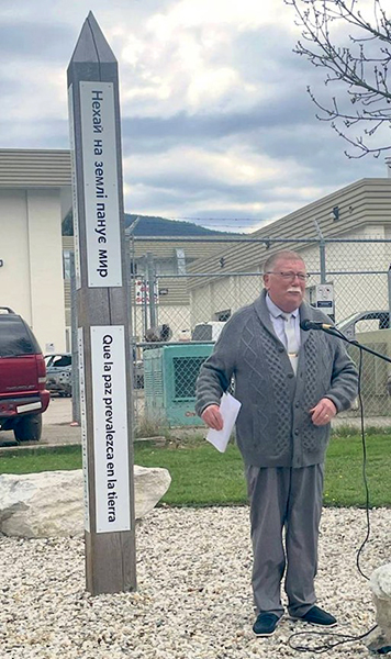 Mayor Everett Baker gave a speech at the Peace Pole ceremonies on Friday at Grand Forks Secondary School as part of activities leading up to the annual Peace Conference on Saturday at the USCC Hall.