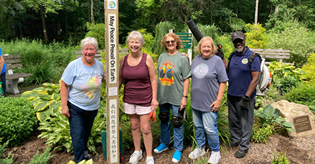 November 10, 2025 Peace Pole adds color and a warm welcome in a residential garden, located down the street from Dickinson College.